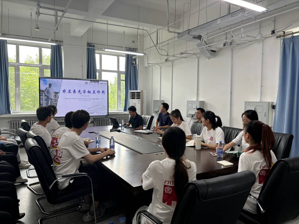 大道至簡,智趣橫生。在南開大學(xué)伯苓樓403會(huì)議室,一場由三位博學(xué)多才的博士生帶來的思想盛宴,讓拔尖創(chuàng)新人才培養(yǎng)實(shí)驗(yàn)班的同學(xué)們沉浸于物理世界的無限遐想之中。不同于傳統(tǒng)理論的堆砌,而是一個(gè)個(gè)無與倫比的奇思妙想。他們巧妙運(yùn)用物理類比,將非互易光學(xué)中的光相互作用比作狐貍與兔子的智慧追逐,生動(dòng)詮釋了光操縱光的奇妙現(xiàn)象,引領(lǐng)大家窺見光學(xué)非線性領(lǐng)域的深邃與廣闊,激發(fā)了探索未知的熱情與想象。隨后,關(guān)于光脈沖的非線性約束及環(huán)形勢中渦旋光束的講述,更是以故事化的手法,讓復(fù)雜的物理概念躍然眼前,促進(jìn)了思維