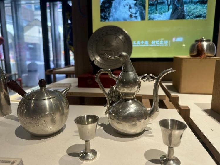 山東省手造展示體驗中心以傳統文化和現代技術為依托,展館內部規劃設置了四層空間,分別以“手造精品”“齊魯手造”“手造會展”“手造研學”為主題,通過琳瑯滿目的手造精品和豐富多彩的文化活動,體現中華傳統文化薪火相傳的賡續發展和生生不息的文化魅力。走進大廳,實踐隊成員被一系列精美的錫器作品吸引,這些作品不僅在設計上巧妙地融入了民族元素,更在材質和工藝上展現了現代創新。錫器細膩的紋理和獨特的民族圖案都是由濟南市的手工藝人精心制作而成,凝聚了他們的心血和對工藝的尊重。