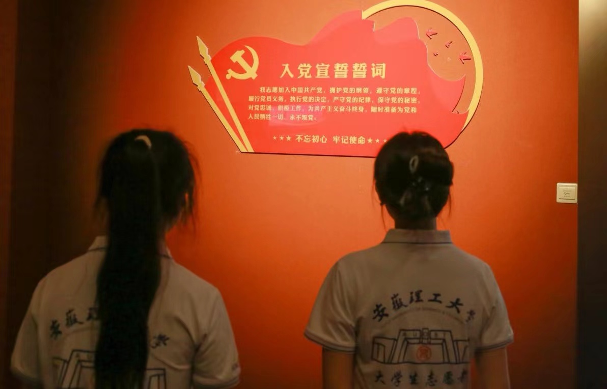 (圖為隊(duì)員志愿服務(wù)隊(duì)隊(duì)員閱讀入黨宣誓誓詞)