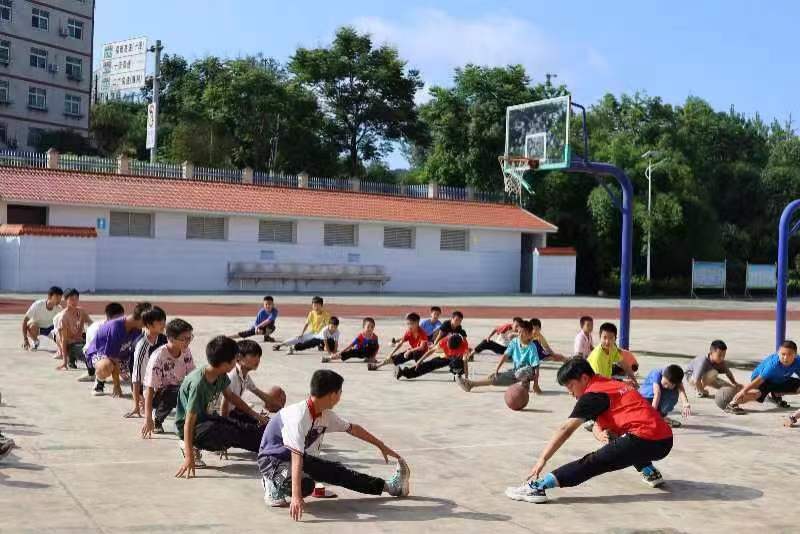 圖為籃球課上小朋友們跟著志愿者老師提前進(jìn)行熱身。多彩大學(xué)生網(wǎng) 隆瑩瑩 供圖