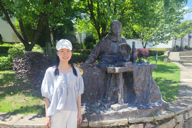 首先,她來到了分水塘的文化禮堂。分水塘文化禮堂中,展示著分水塘的發展歷程,同時也展示著陳望道先生的生平經歷。從閱讀陳望道先生在教學中的故事的過程中,她學習陳望道先生身上優良的教育品質。
