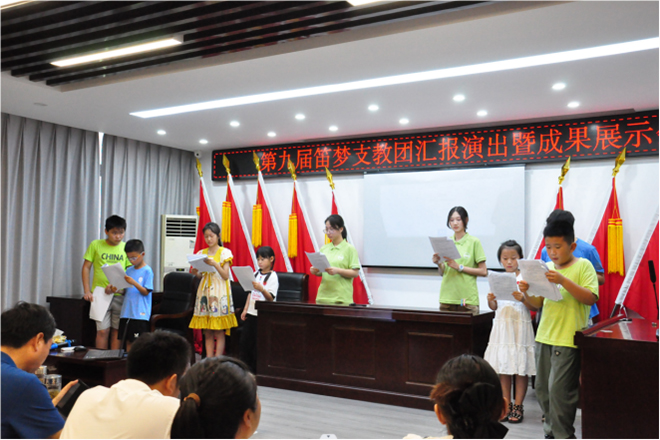 7月17日,是第九屆“笛夢”支教團在合肥磨店街道張店居委會開展課程活動的最后一天。志愿者們帶領同學們舉行最后的匯報表演暨畢業聯歡會。