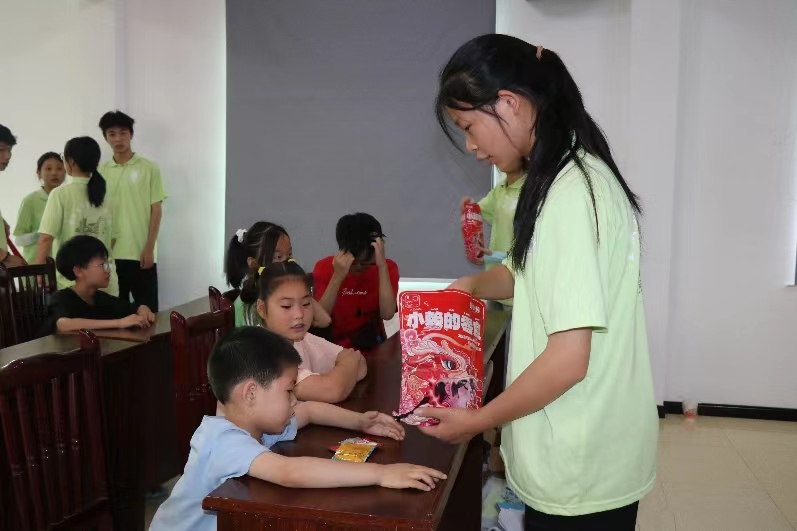 圖為休息階段給留守兒童分發小獎品。中國青年網通訊員 藍添宜 供圖