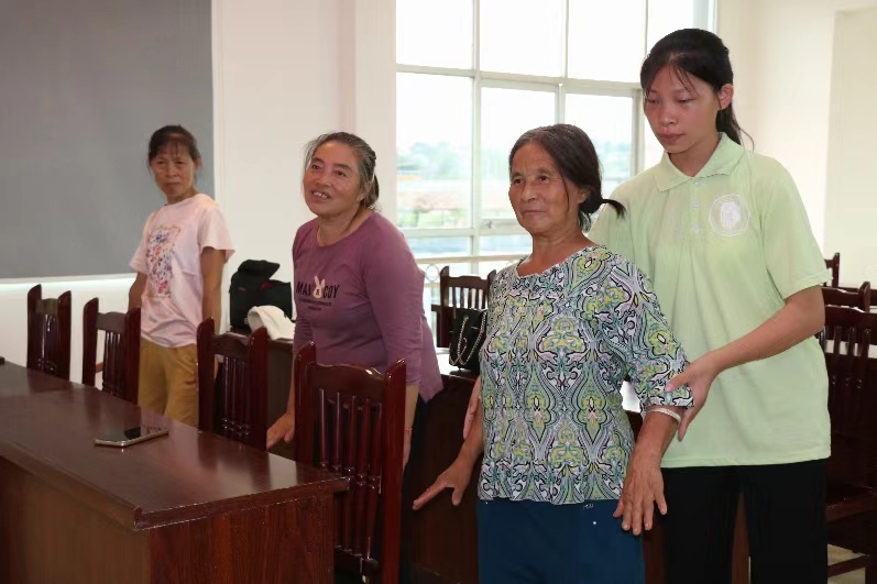 圖為實踐隊員協助兒童照護者一同學習八段錦。中國青年網通訊員 藍添宜 供圖
