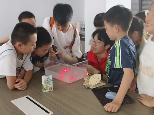 活動現(xiàn)場,富強社區(qū)的工作人員和蘇州城市學院的志愿者們通過一系列精彩的實驗和互動體驗,向孩子們展示了光的直線傳播、折射、反射、等基本原理。在“光的折射與反射”模塊,志愿者通過讓孩子們觀察光線在混入牛奶的水中的傳播路徑和折射現(xiàn)象,深入理解折射原理。