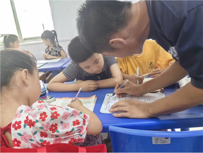 下午,志愿者們給孩子們進行作業(yè)輔導。四到六年級的孩子在教室里認真地寫著作業(yè),志愿者們在一旁輔導。稍微小一點的孩子,在課桌上畫著畫,把他們所想的全部呈現(xiàn)在紙上。