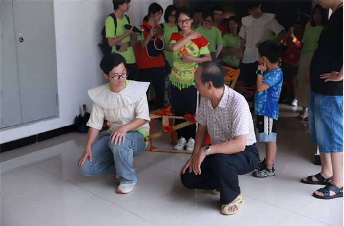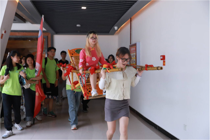 隨后隊員們親身體驗“滑竿抬幺妹”。在傳承人的指導下,隊員們在抬滑竿中逐漸找到團隊協作的默契。現場便充滿歡聲笑語,隊員們在實踐中加強了對團隊協作理解。