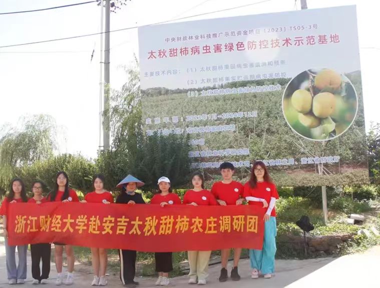 為深入了解安吉太秋甜柿種植情況與市場前景,優化以太秋甜柿為主要產品的“金柿福”品牌產品服務質量,提升品牌知名度與影響力,推動“兩山共富,鄉村振興”的實現,浙江財經大學金融學院赴安吉“太秋映田柿,山青道共富”實踐服務團九名成員在張紅老師的帶領下走訪湖州安吉青龍村,開展為期一周的實踐服務活動。