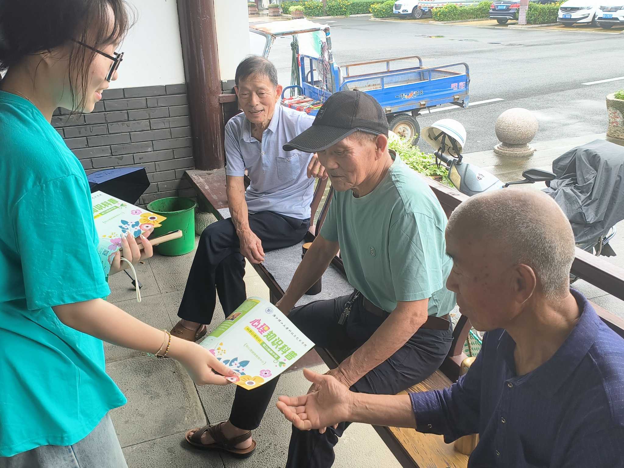 盡管天空下著小雨,天氣悶熱,但實踐團成員們熱情不減,早早抵達潘韓村。他們通過分發心理健康調查問卷和宣傳冊,與村民們進行深入交流,了解他們的心理健康狀況,普及心理健康知識。
