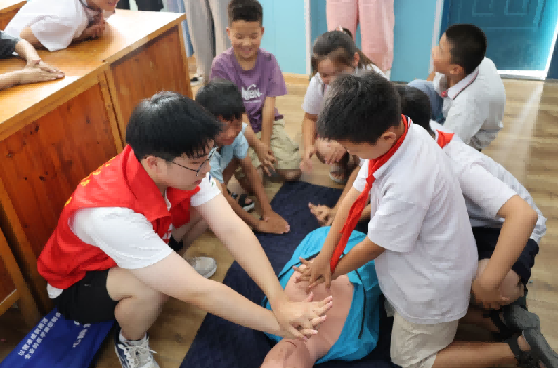 同時,實踐團成員從救護基本知識、救護技能和突發事件應對三個方面向居民展開講解,使用模擬人教具逐步示范急救過程中心肺復蘇術的操作要點,進一步提升了社區居民的應急救護能力。