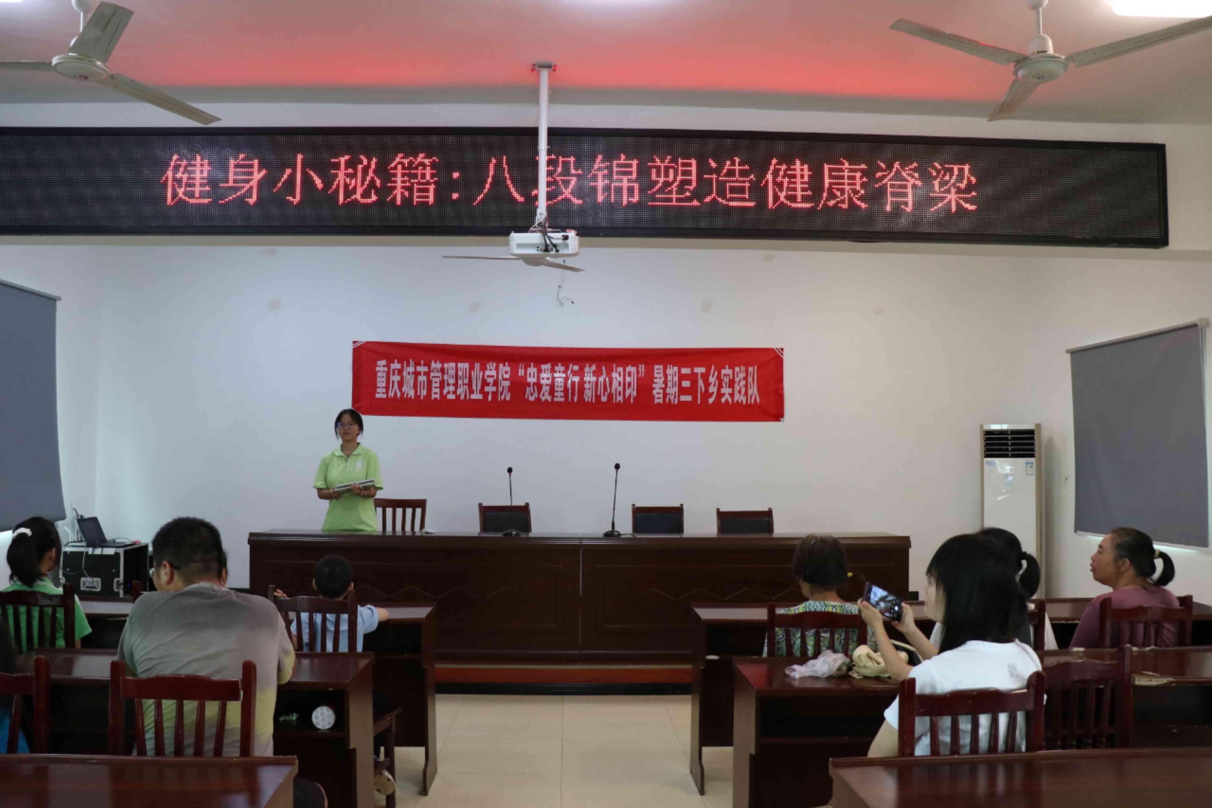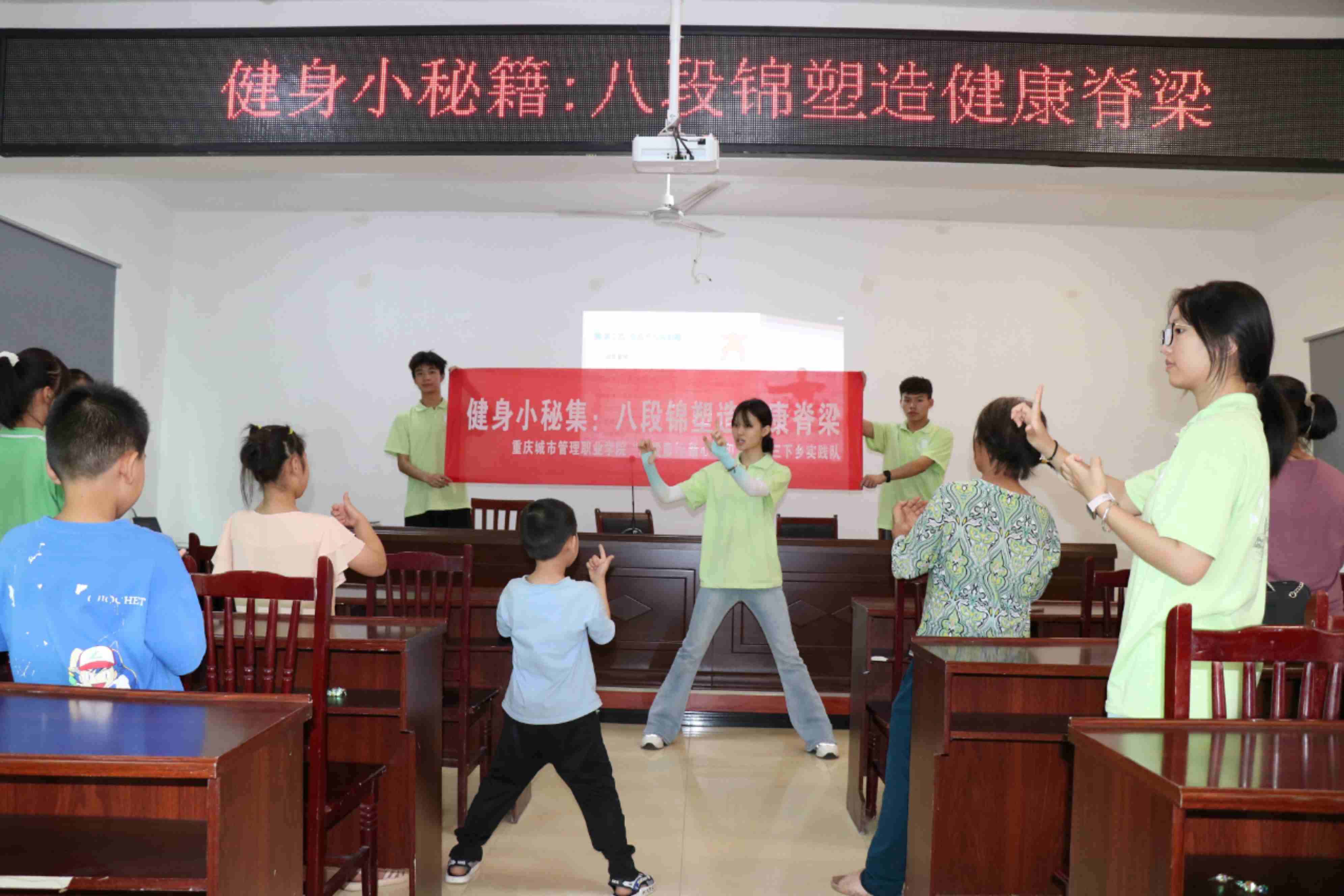 天行健,君子以自強不息。擁有強健的體魄是個人學習和工作的前提,更是中華民族偉大復興前行的不竭動力,為助力少年兒童茁壯成長,大力弘揚傳統文化。近日,重慶城市管理職業學院“忠”愛童行,“新”心相印實踐隊走進忠縣新立鎮雙柏村,為當地小朋友們開展了基于康養認知的健康保健小課堂。活動以“強心健體”為主題,深入科普了合理膳食營養,詳細介紹了八段錦這一古老而神奇的健身功法。“兩手托天理三焦,左右開弓似射雕。”孩子們一雙雙稚嫩的小手跟隨著實踐隊成員們在空中揮舞,在場的爺爺奶奶們也跟著動起來了,一場老青幼互動的視覺盛宴讓人耳目一新。在本次活動中,實踐隊成員結合自身專業知識,推廣了中國傳統文化,有助于小朋友們提升身體素質,緩解心理壓力,塑造健康人格。未來我們還將走進各個基層崗位開展更多啟智潤心的活動,生動展現新時代新青年的別樣風采!(通訊員 王涵)