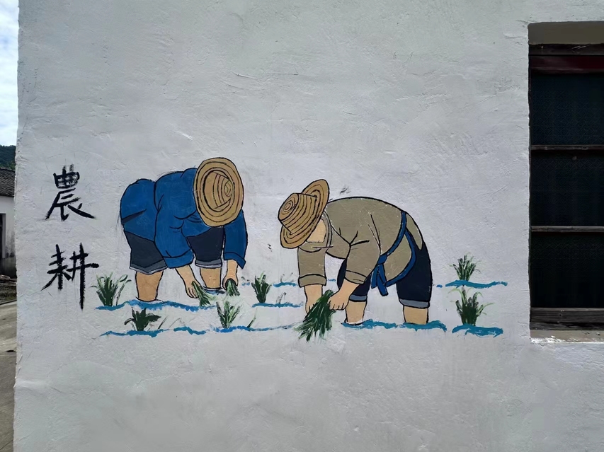 (圖為農(nóng)耕文化主題墻繪中農(nóng)民插秧苗的場景。)