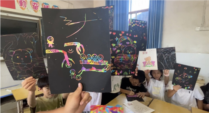 刮畫興趣課如同一場綿綿春雨,滋潤著孩子們的心靈;傳聲筒興趣課如同一道雨后彩虹,為孩子們的成長之路增添了無盡色彩。“小喇叭”實踐隊的支教之旅仍在繼續(xù),他們將繼續(xù)在這片土地上傳遞愛與知識,讓美育之花在這里綻放得更加絢爛。