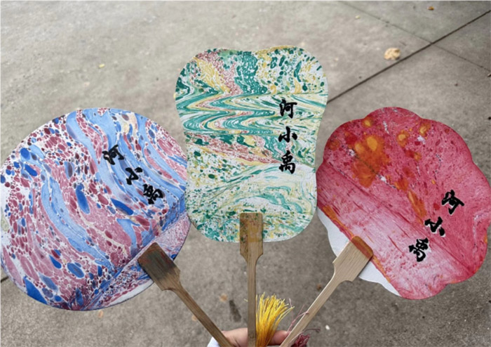三是面向村中小朋友舉行了“制作河小禹的漆扇”活動。只見一口大缸,各色大漆落于水面散開,扇面緩緩入水,或旋轉,或晃動,五彩斑斕的顏色、高山流水般的紋路躍然紙上,這是獨屬于漆扇的美。漆扇的制作雖需一定技巧,但在小朋友們的極高熱情和實踐隊隊員們的悉心教導下,小朋友們輕松地制作出了屬于自己的瑰麗漆扇。非物質文化遺產的魅力與生態文明建設的決心相互融合,“河小禹”走進民心,引入新生血液,壯大了“河小禹”的力量。