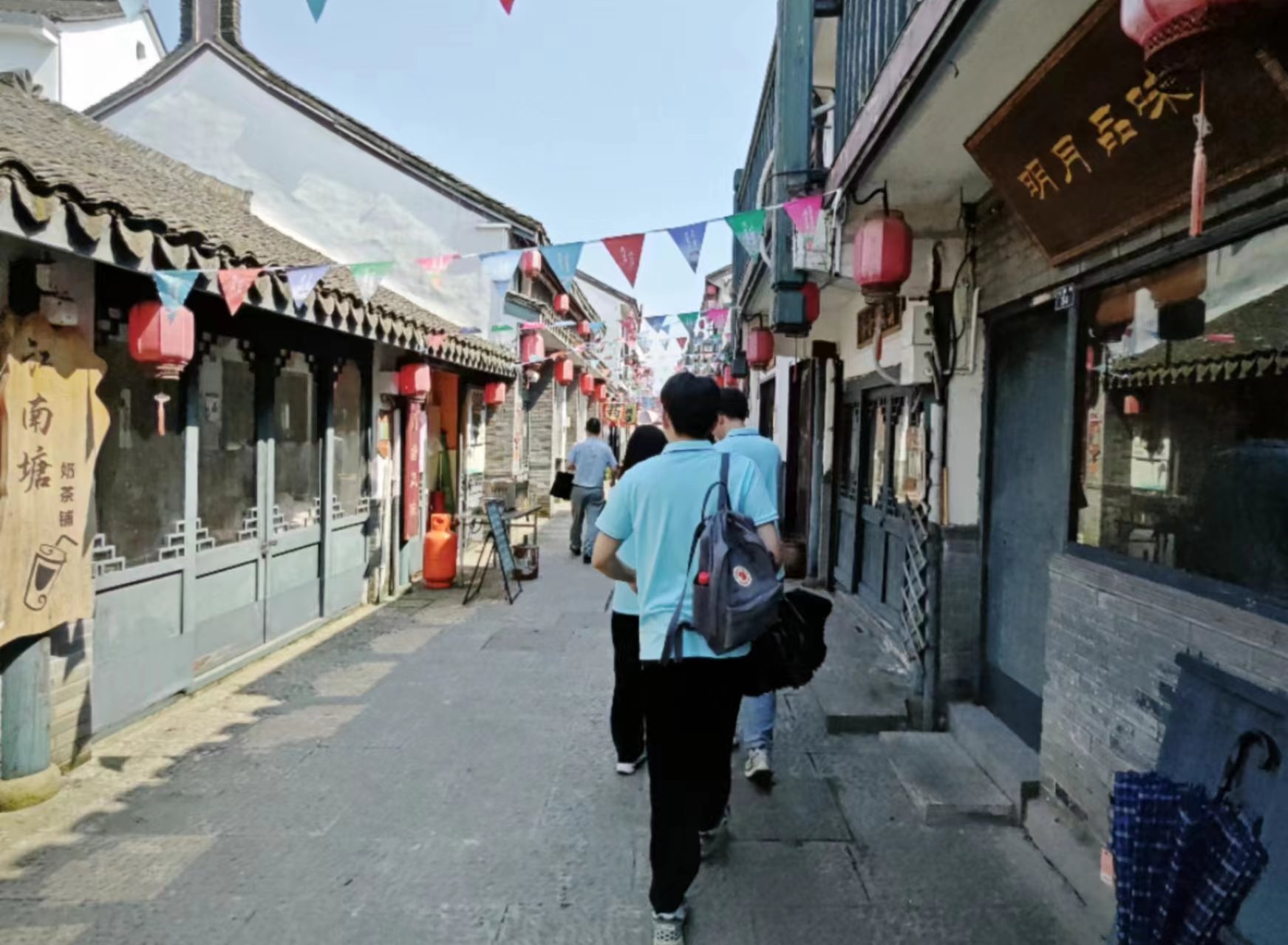 一橋跨兩省,共繪山塘新畫卷實踐團首站來到了享有“一橋兩山塘”美譽的山塘村,這里跨越浙江與上海,形成獨特的“南北山塘”景觀。“在黨建引領(lǐng)下,我們與廊下鎮(zhèn)山塘村共同打造了‘山塘模式’,實現(xiàn)了資源共享、優(yōu)勢互補。”毗鄰黨建展示館講解員介紹道。實踐團成員們認真聆聽講解,并提出自己的疑問:“那這種模式是如何避免同質(zhì)化競爭的呢?”在深入交談后,實踐團成員進一步了解到,兩村憑借各自在農(nóng)旅與歷史文化上的優(yōu)勢,以共享、共融、共贏為發(fā)展核心,推動農(nóng)文旅深度融合,實現(xiàn)錯位互補發(fā)展,廊下鎮(zhèn)山塘村主打民宿和農(nóng)業(yè)體驗,而廣陳鎮(zhèn)山塘村則專注于農(nóng)家樂、文化體驗與科技農(nóng)業(yè)。共同打造的明月山塘景區(qū)已晉升為國家4A級景區(qū),這種錯位發(fā)展既促進了兩村協(xié)同發(fā)展,又避免了同質(zhì)化競爭,有效推動浙滬兩地景區(qū)跨區(qū)域聯(lián)動,成為鄉(xiāng)村共富的典范。隨后,團隊成員來到明月山塘景區(qū),行走在明月山塘老街,親身感受了“一橋跨兩省”的山塘橋所帶來的地域融合與文化交流。老街上的非遺體驗館、傳統(tǒng)美食館及傳統(tǒng)與現(xiàn)代完美結(jié)合的咖啡館,無一不展示著山塘村在黨建引領(lǐng)下實現(xiàn)共同富裕的顯著成效。