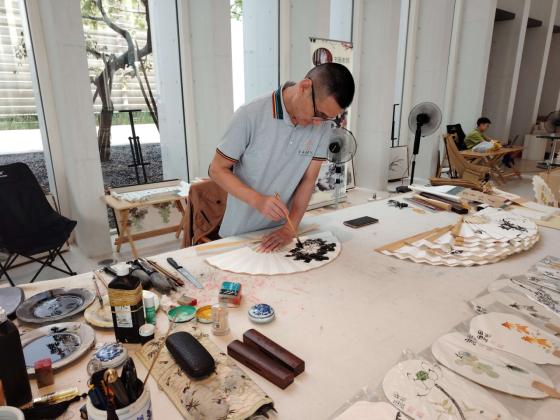 宣紙,作為中華傳統文化的瑰寶,以其獨特的制作工藝和藝術價值,享譽世界。對中國文化宣紙園進一步參觀,一系列由宣紙制成的手工藝品映入學生眼簾。各式各樣不同花色款式的扇子陳列在展覽柜臺上,不同種類不同用途的宣紙也擺放在展示柜之中供游人購買參觀,墨筆硯與宣紙一起擺放,形式古韻優美,古人高雅淡然的氣質悄然綻開。場館中繪畫師在一方長桌上就著筆墨與彩料在折扇與團扇上作畫,墨色在紙上流轉,如同山間清泉,自然而生動。畫家的每一滴墨,每一抹色彩,都能在宣紙上找到它們最完美的歸宿。墨色在紙上緩緩展開,如同云霧繚繞,層次分明,深淺有致。實踐團隊也伴隨著宣紙師傅的講解了解到宣紙的悠久歷史,其獨特的用途與優點均全面的展示在大家面前,時間團隊對宣紙獨特魅力深有體會,不僅是其柔軟細膩的觸感,也是其對墨水的吸收性非常好,能夠展現出墨跡的層次和深淺變化,耐久性很強,可以保存數百年而不褪色,不脆化。宣紙在歷史長河中歷久彌新,恒古流長。
