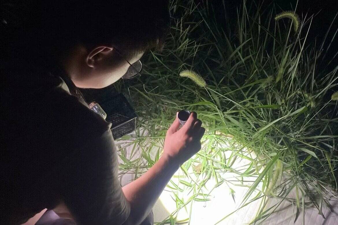 (圖為實(shí)踐隊(duì)員等待草地中出現(xiàn)兩棲爬行動(dòng)物 楊芯雨 攝)