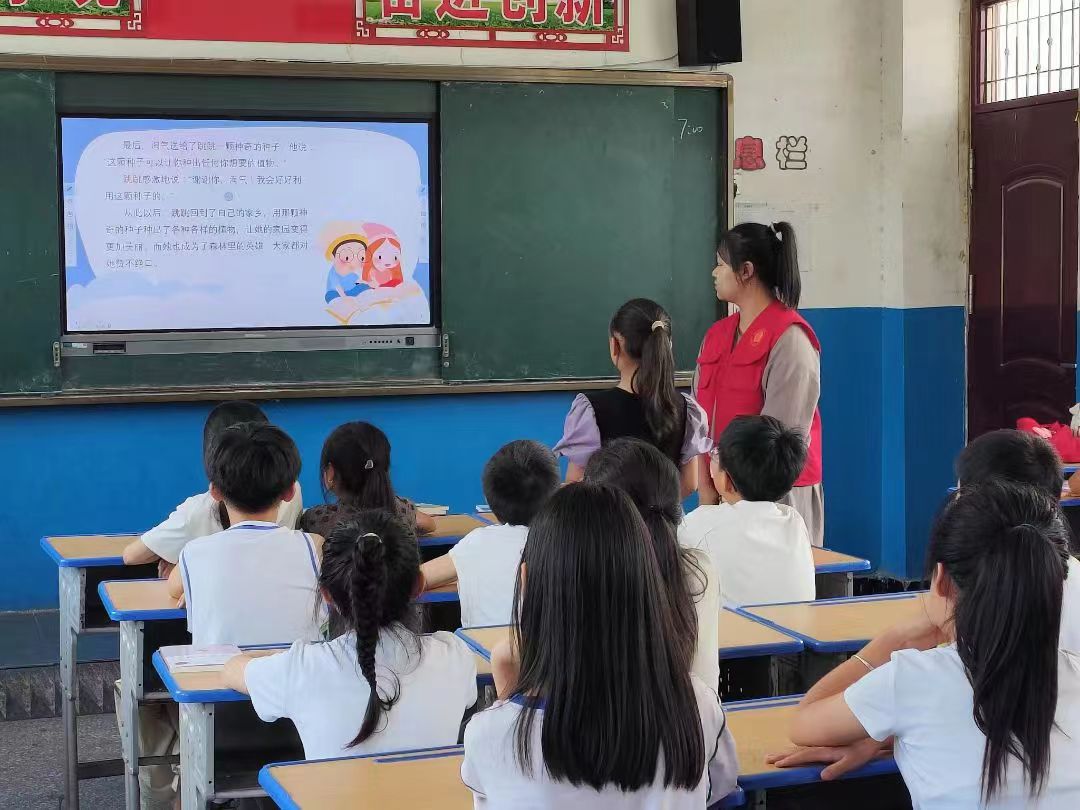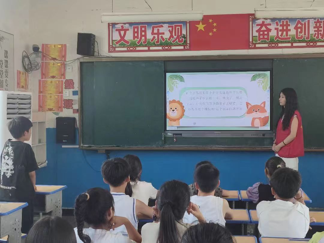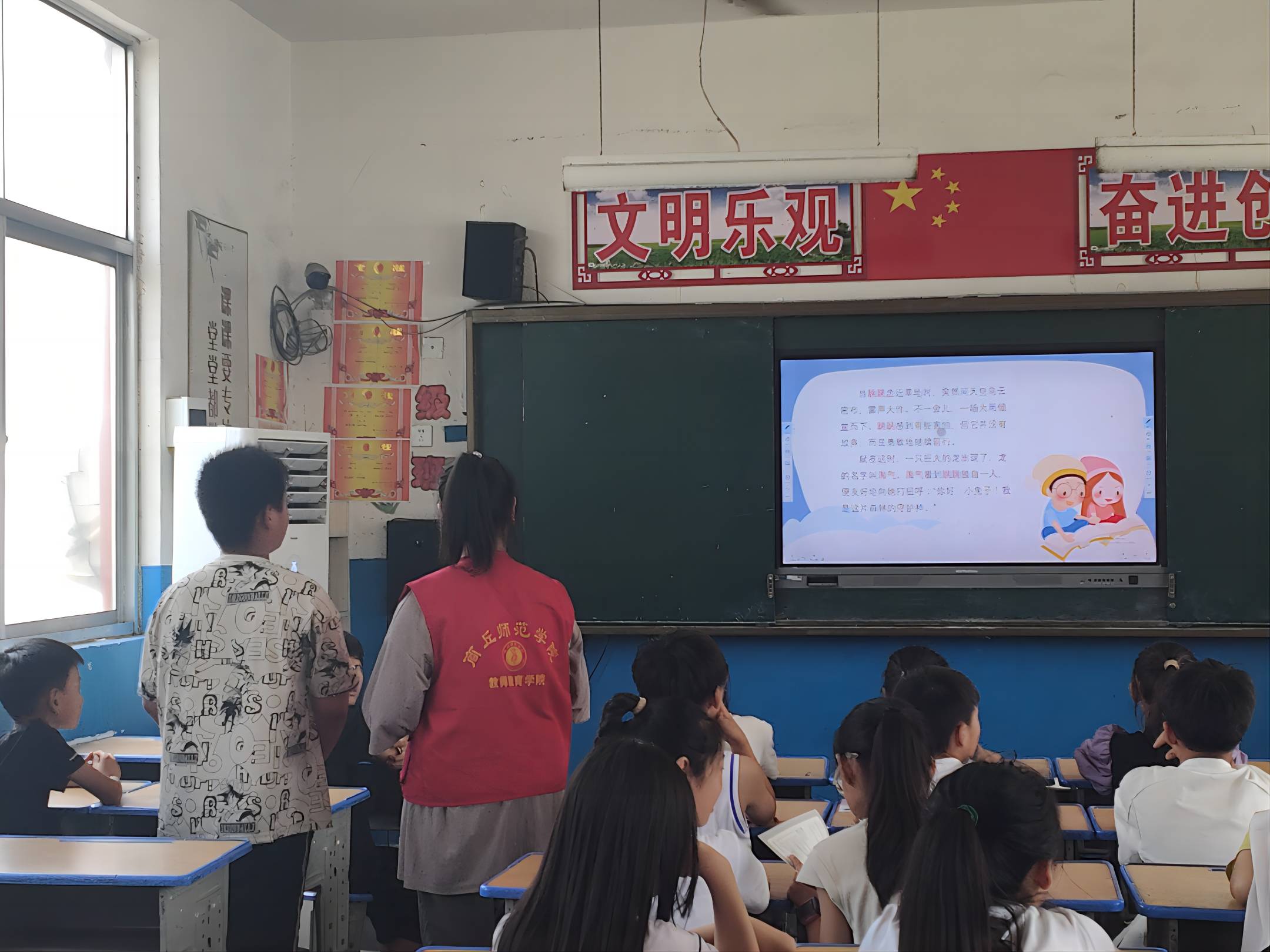 為“深入推進全民閱讀,建設‘書香中國’”。進一步推動全民閱讀實現高質量發展,團隊深入教育教學一線,從“第一顆扣子”抓起,推動農村中小學打造書香校園,2024年7月,團隊走進河南省商丘市柘城縣惠濟鄉雙廟小學,為小學的孩子帶去閱讀指導課程。 團隊一行在指導老師的帶領下,早七點準時出發前往惠濟鄉雙廟小學,小學距離較遠,團隊一行乘車一小時半才抵達目的地,校領導早早就在路口等待。隨后,團隊一行跟隨校領導走進校園,孩子們安安靜靜地坐在教室里等待老師上課,校老師表示:“孩子們八點就準時到學校了”。團隊和校領導簡單的交談之后便走進教室開始了此次的閱讀指導課程。