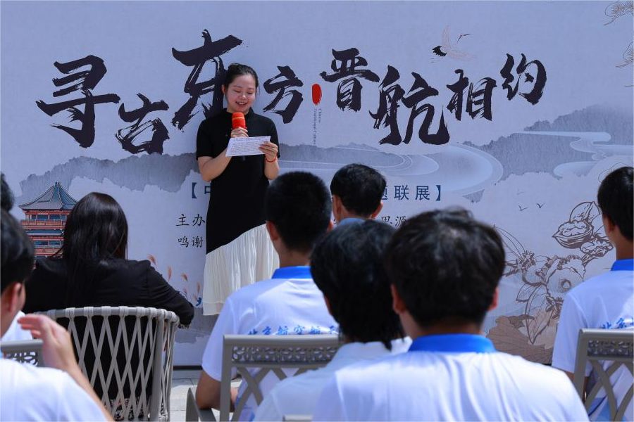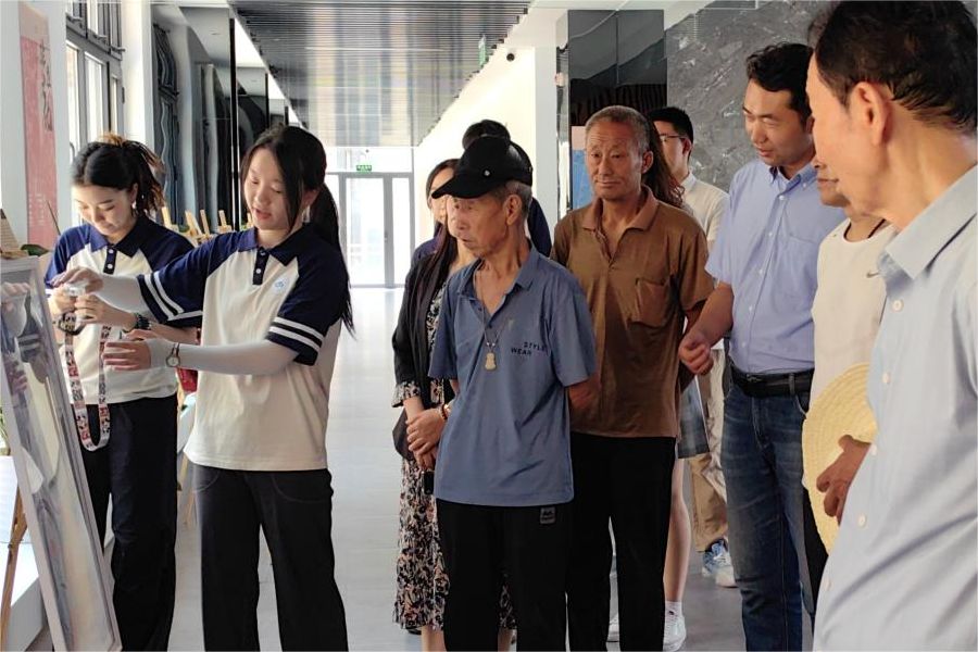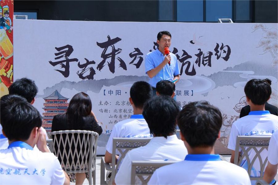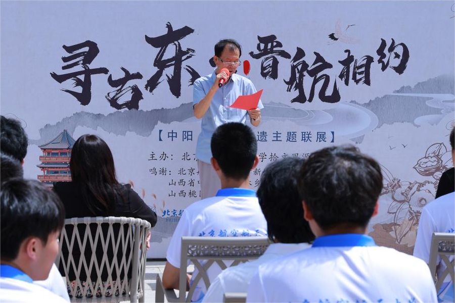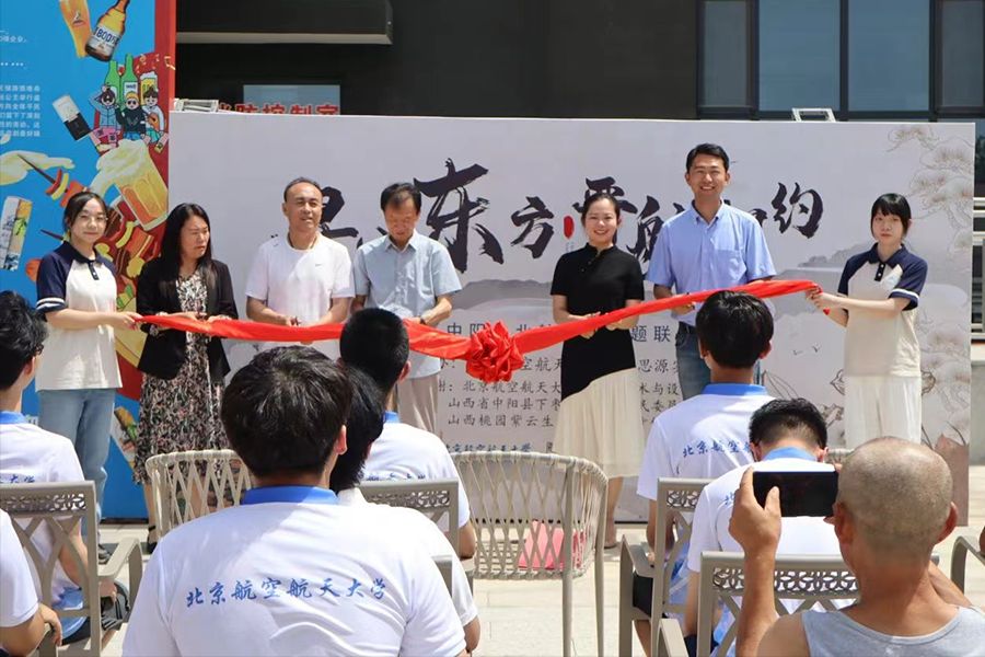 7月22日上午,“尋古東方·晉航相約”中陽—北航非遺主題聯展(以下簡稱“展覽”)開幕式在中陽縣陽坡村科技樓前廣場舉行。山西桃園騰陽能源集團董事長陳富平、桃園紫云生態牧業有限公司文旅負責人喬晉平、北航新媒體藝術與設計學院團委書記于秋漫、中陽縣陽坡村黨支部書記李俊蓮、陽坡村駐村第一書記伊志豪出席開幕式,北航拾文思源實踐隊、旭風啟航實踐隊隊員及陽坡村村民參加,開幕式由魏云帆主持。