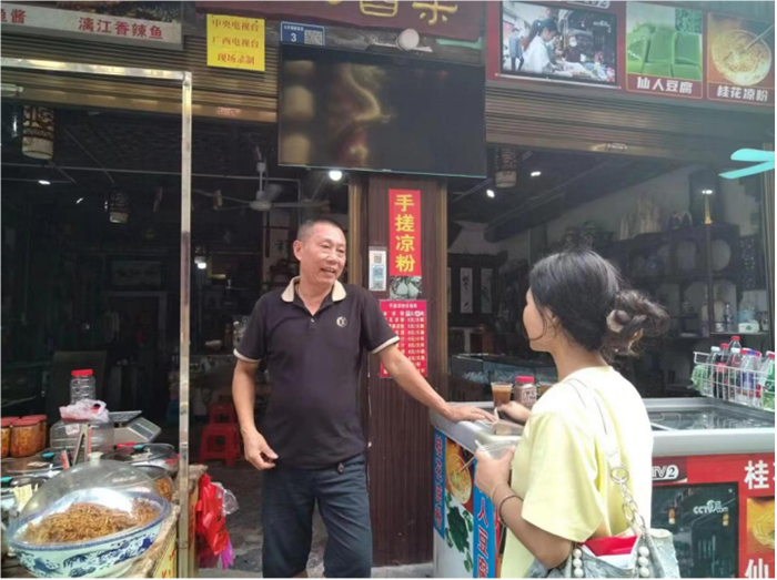 圖為實踐隊員與大圩古鎮景點的商鋪老板交談,了解當地居民對大圩古鎮文化特色以及旅游業發展的感受。通訊員 胡一茗 供圖