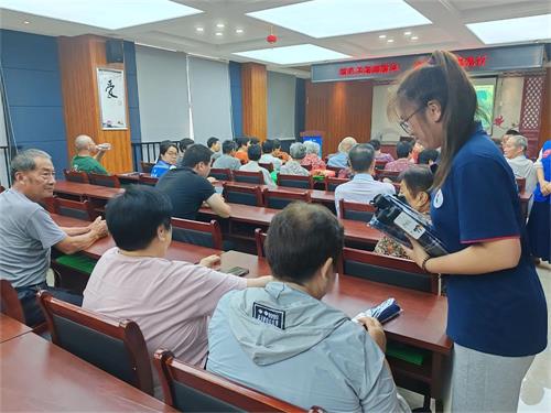 圖為講座開始前給居民分發(fā)本次的宣傳單和獎品