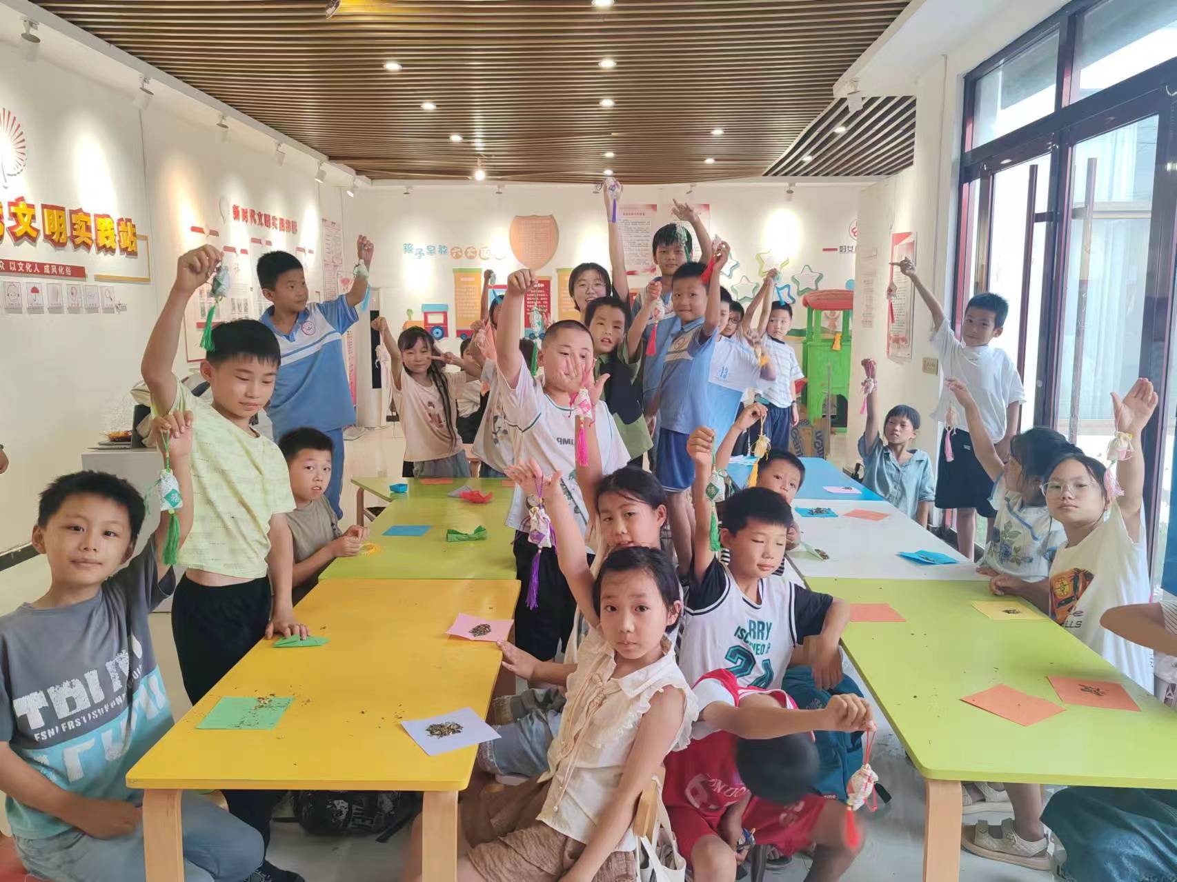 “巧手制囊”驅蚊香囊制作活動之后,孩子們積極展示。攝影:陳佳怡