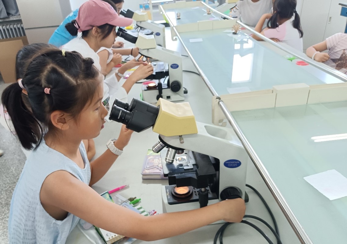 (圖為小朋友們在《植物喝水的秘密》課程中利用光學顯微鏡觀察植物根莖的細胞)