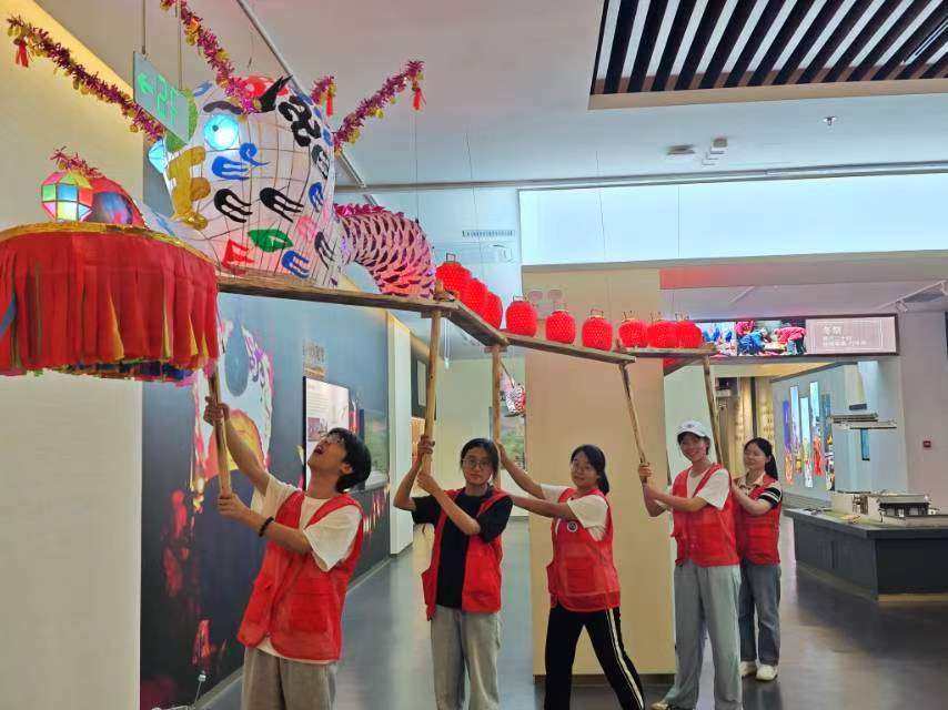 圖為服務(wù)隊(duì)成員體驗(yàn)舞龍燈。(通訊員武洋 攝)