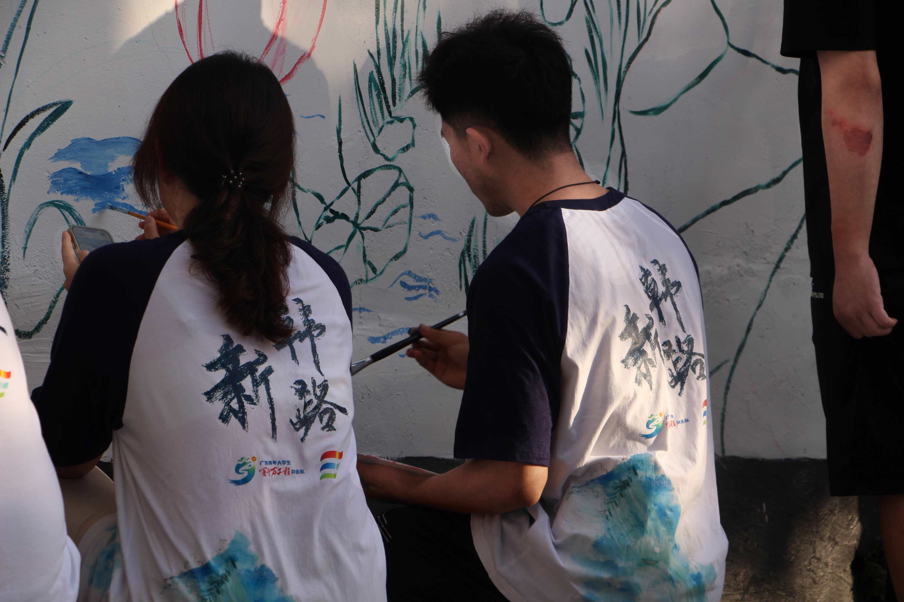 在繪制的過程中,莊主任也為團隊送來清涼的水和防暑藥物,確保每位隊友都能保存最佳狀態,防止因高溫引發不適。同時也不斷有路過的村民們和游客們駐足,他們拿起手機記錄著動人的瞬間,原本單調的墻面在隊員們的手下煥發出勃勃生機,大家一齊見證了原本單調的墻面蛻變為生動藝術作品的過程。