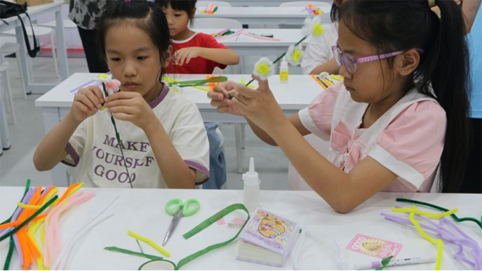 圖為社區(qū)兒童用扭扭棒制作小雛菊 浙商大供圖