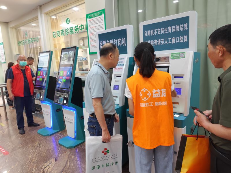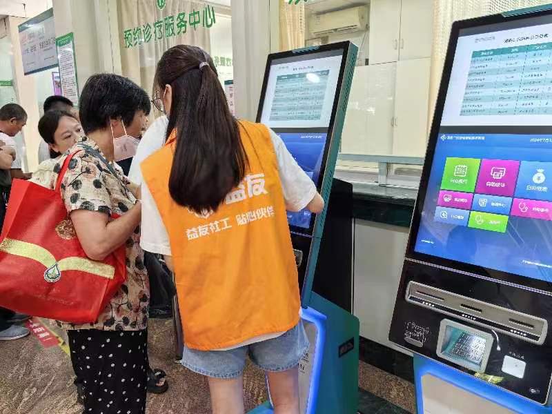 圖為實(shí)踐團(tuán)成員協(xié)助患者使用自助服務(wù)機(jī)。潘宇純 供圖