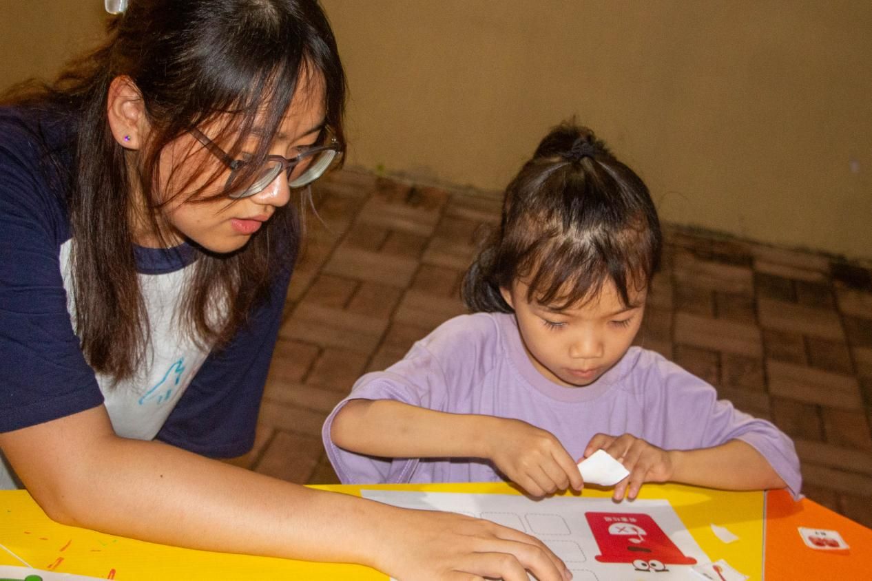 圖為實踐隊隊員向小朋友介紹活動規則。 張溢圻 攝