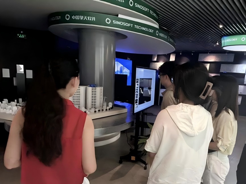 在運營總監郭李麗女士的引領下,實踐隊第二站來到了企業的成果展廳。這里,通過詳實的展示板和生動的實物展示,學生們初步了解了擎天科技的成長歷程、主要產品及服務,以及公司在信息化平臺建設、碳管理數字化解決方案和財稅數字化轉型等領域取得的重要成就。展廳中,公司如何運用大數據技術提升城市管理效率,以及如何利用數字化手段進行碳管理的案例特別吸引了學生們的注意。這些內容讓學生們對公司的業務有了更加直觀的認識。