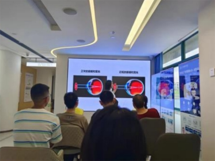 在大家進行基礎檢查之后。志愿者與參與者一起觀看愛眼護眼視頻,了解護眼知識,一同聆聽專家講解。