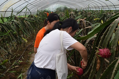 隨后,在曾強先生的帶領下,實踐團成員深入田間地頭,親眼見證了火龍果從枝頭到籃中的奇妙轉變。成熟的火龍果掛滿枝頭,色澤鮮艷、果實飽滿,散發著誘人的香甜氣息。大家紛紛動手參與采摘,體驗了農耕文化的樂趣與艱辛,同時也更加直觀地感受到了現代農業科技的魅力。