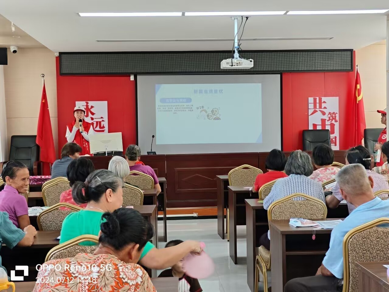 除了實地走訪外,7月14日上午實踐小隊還在黃金村開展了肝吸蟲病知識宣傳講座,居民們對于本次活動都十分感興趣,在村委會的召集下,村中許多居民到達現場,在問答環節,居民們踴躍提出自己的問題,實踐隊隊員耐心向居民們回答。在活動開展過程中,村民們對肝吸蟲病相關知識的展現出非常高的積極性,在講座中實踐隊隊員,倡導居民們養成良好的飲食習慣,提高對此類疾病的重視程度,共營健康生活的良好氛圍。