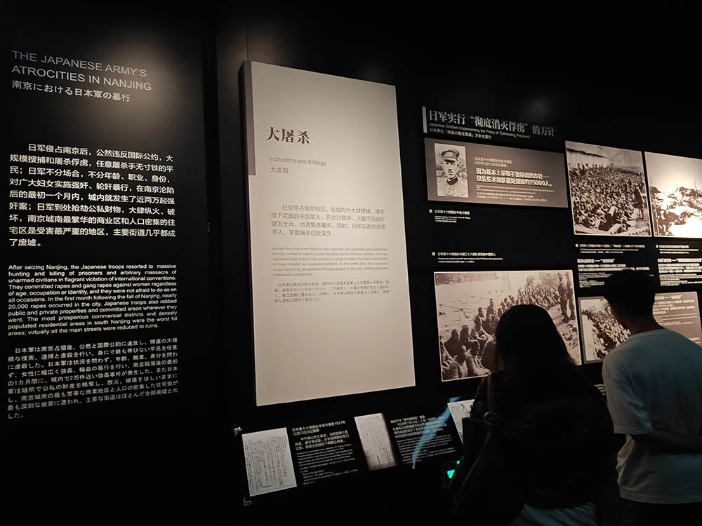 隨后團隊來到集會廣場災難之墻上面刻有中、德、韓、西班牙等11種文字的“遇難者300000”。旁邊十字架型的標志碑下鋪著一層層碎石,意味著紀念館是建立在萬人坑遺址之上的。