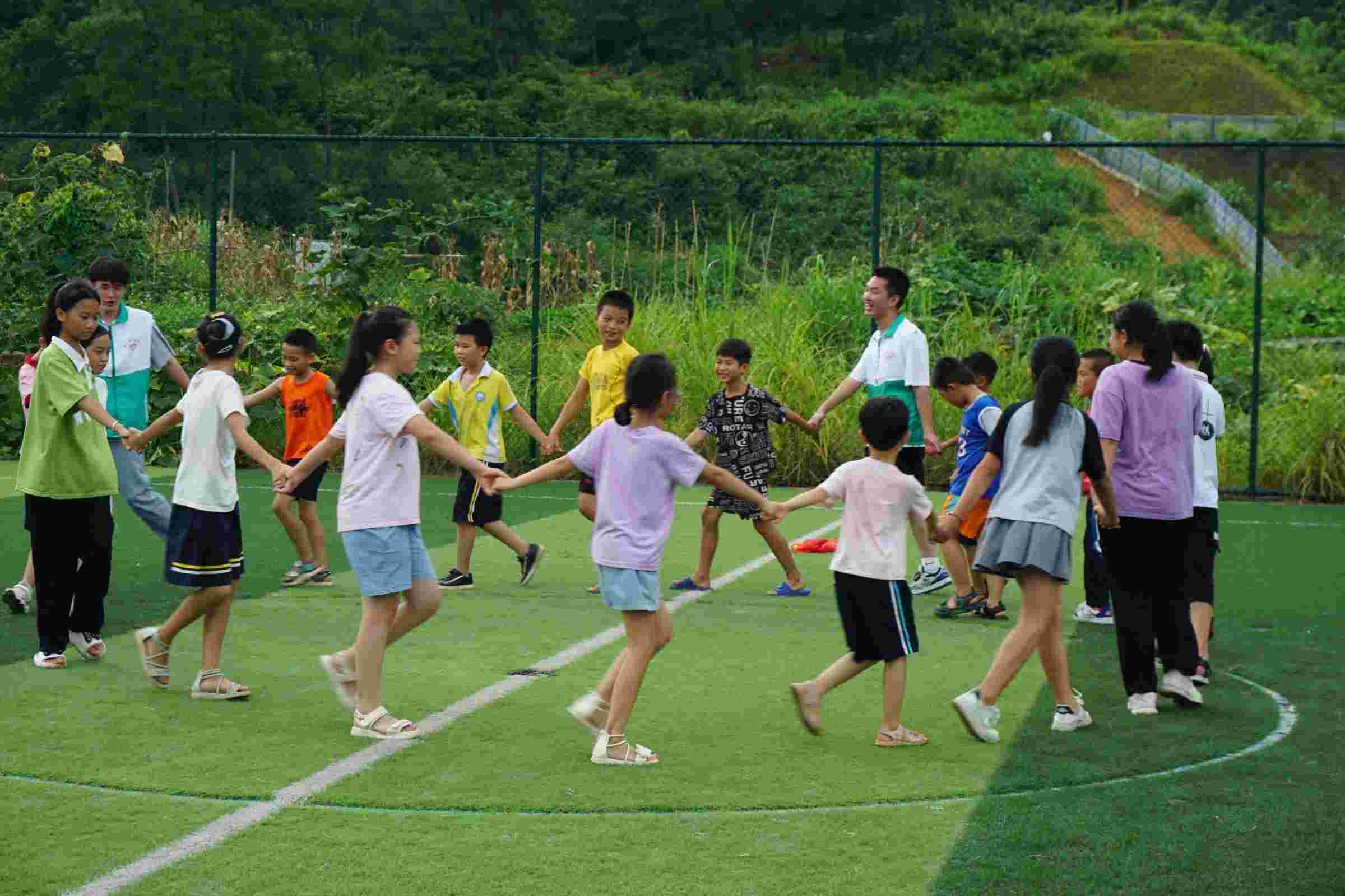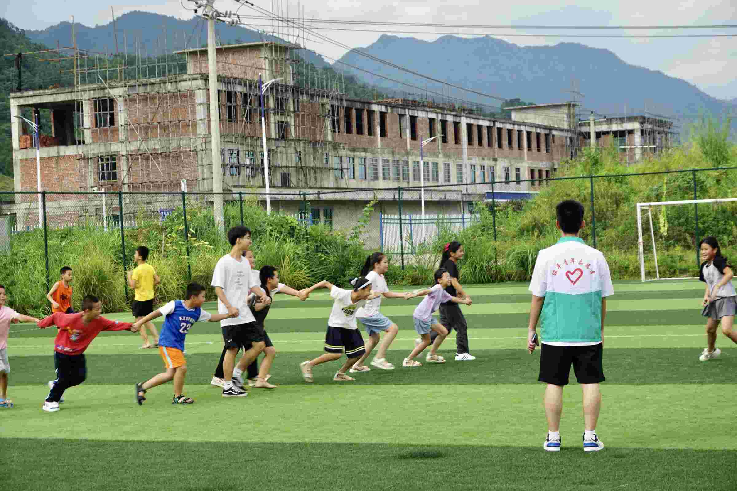 圖為團隊成員在與學生進行游戲2針對上述問題,調研隊在綜合考量社會實際和當地產業發展現狀的基礎上提出了一系列切實可行的解決措施。首先,政府應加大對易地扶貧搬遷社區體育設施的投入,確保社區有足夠的體育活動空間;其次,通過政策引導,促進體育資源向社區傾斜,實現資源的優化配置;再次,通過加強體育教師和教練的培訓,提高他們的專業水平,以滿足社區青少年的體育需求;最后,通過組織各類體育活動,增強青少年對新社區的認同感,激發他們參與體育活動的熱情。