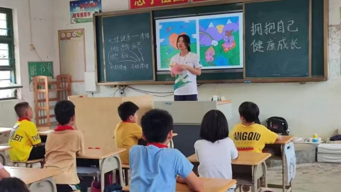 迎著盛夏的朝陽,湛江科技學院艾在陳及實踐團在團隊指導老師吳思如的帶領下于7月1日為湛江市經濟開發區東山鎮昌邏北邊村紅星小學三年級1班帶來了一場不同于日常的課堂體驗——“擁抱自己,健康成長”心理活動宣講與“小小文明使者,大大社會力量”衛生活動宣講,主要通過觀看趣味視頻、游戲互動和繪畫等豐富多彩的活動形式,初步了解本班小學生心理健康發展情況和對表現出情感焦慮的學生進行及時開導,提醒他們在日常中培養良好的衛生習慣。
