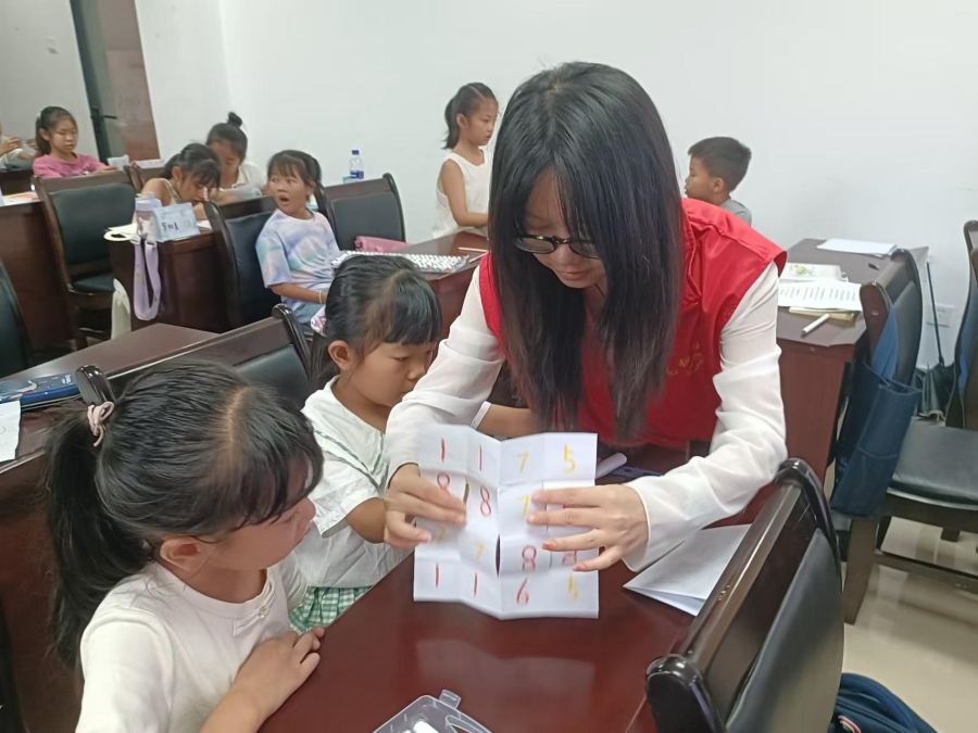 圖為在趣味數學課上,支教老師在指導孩子完成”紙魔方"游戲 黃思蓉攝