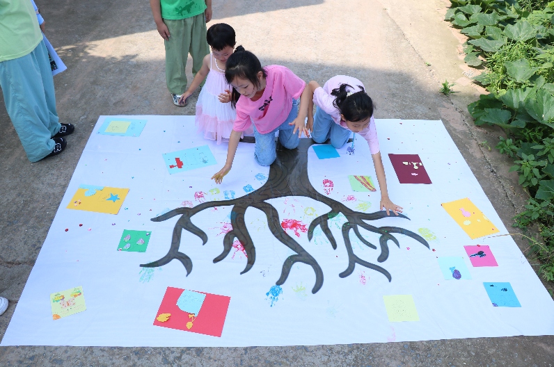 圖為留守兒童們共同繪制手印之樹。 藍添宜 供圖