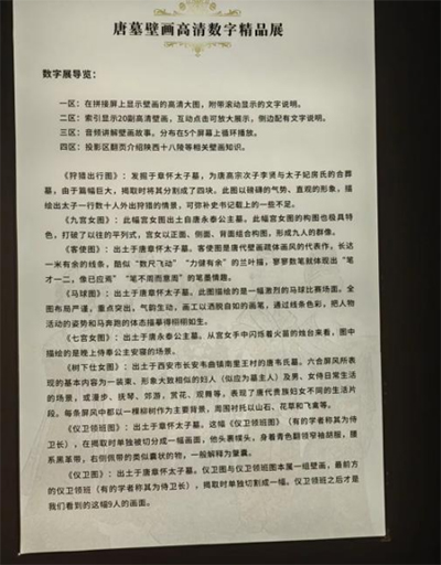 通過和館內志愿者的交流,成員們了解到博物館有專門的數字展廳和不定期的數字展覽,如“唐墓壁畫高清數字精品展”,展覽在拼接屏上展示出壁畫的高清大圖附帶滾動文字說明,20幅高清壁畫通過互動點擊可放大顯示,通過指尖的點擊與掃碼,壁畫高清化、智能化,放大了每一處精美的細節供人們觀覽。