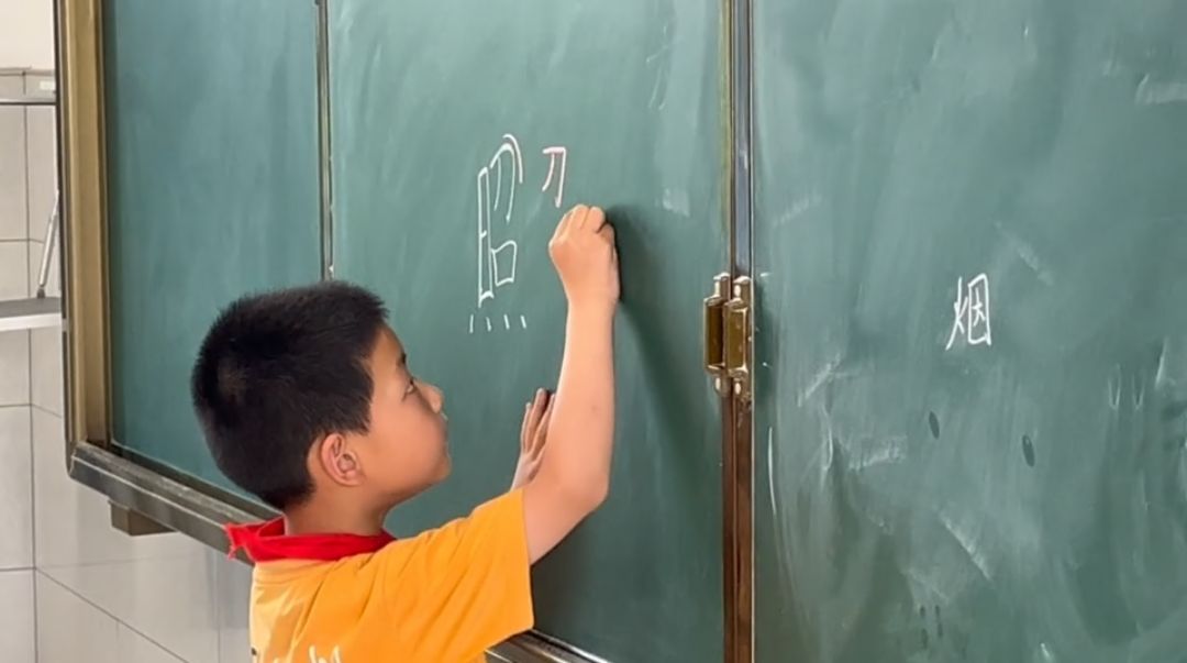 圖為實(shí)踐成員進(jìn)行“有趣的漢字”授課。劉羽彤 攝二、探索:書(shū)寫(xiě)漢字奧秘 為了讓孩子們更加直觀地感受漢字的魅力,活動(dòng)特別設(shè)置了“漢字書(shū)寫(xiě)體驗(yàn)區(qū)”。在這里,孩子們有機(jī)會(huì)親手觸摸古老的碑帖、臨摹經(jīng)典的書(shū)法作品。他們小心翼翼地拿起毛筆,蘸上墨汁,在宣紙上緩緩書(shū)寫(xiě),雖然筆觸略顯稚嫩,但那份專注與認(rèn)真卻讓人動(dòng)容。書(shū)法是漢字文化的重要組成部分。孩子們?cè)趫F(tuán)隊(duì)成員的指導(dǎo)下,一筆一劃地練習(xí)著楷書(shū)、行書(shū)等字體,感受著漢字書(shū)寫(xiě)的韻律美與意境美。通過(guò)親身體驗(yàn),孩子們不僅學(xué)會(huì)了如何正確書(shū)寫(xiě)漢字,更體會(huì)到了書(shū)法藝術(shù)的魅力所在。通過(guò)這一環(huán)節(jié),孩子們不僅學(xué)會(huì)了正確的書(shū)寫(xiě)姿勢(shì)和筆畫(huà)順序,更深刻體會(huì)到了漢字書(shū)寫(xiě)中所蘊(yùn)含的韻律美與意境美。