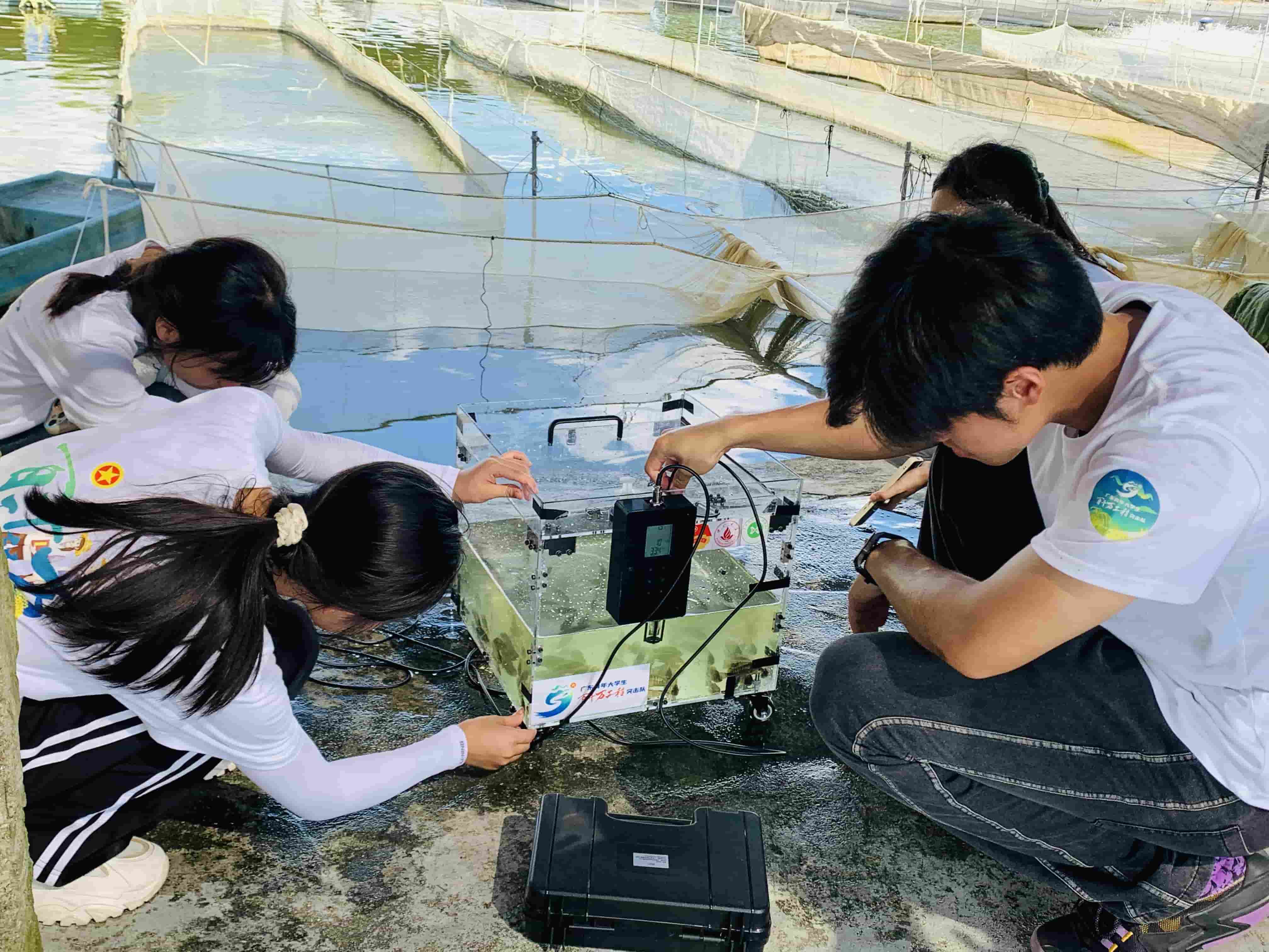 “漁”躍鄉村實踐團在都斛村東利漁場實地調試研發的智慧羅非魚苗運輸多參數監控設備