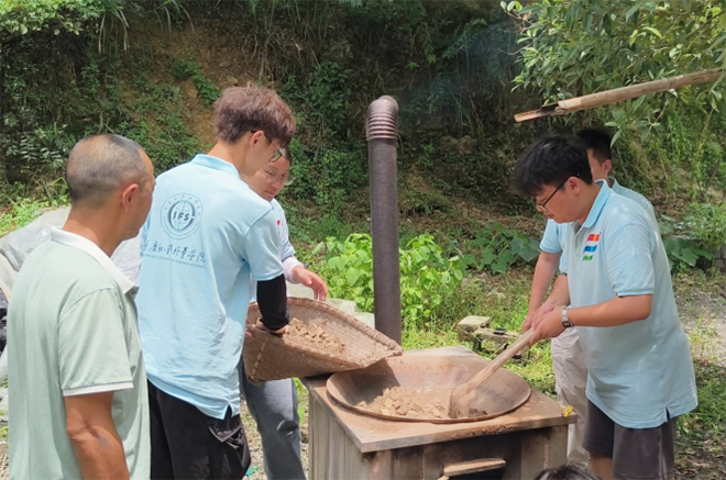 圖為實(shí)踐團(tuán)成員體驗(yàn)灰豆腐的炒制(通訊員:張均)