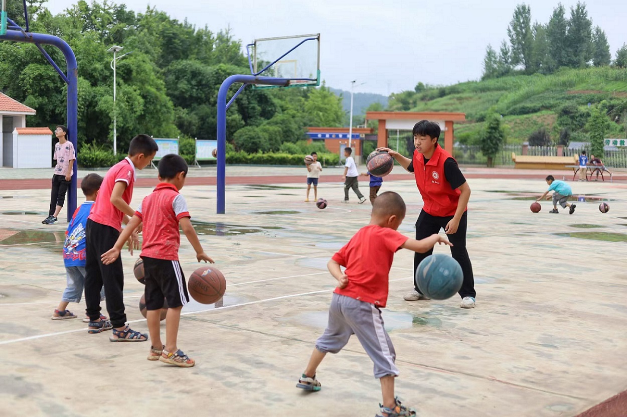 圖為志愿者向孩子們傳授正確的運(yùn)球動(dòng)作。隆瑩瑩 供圖