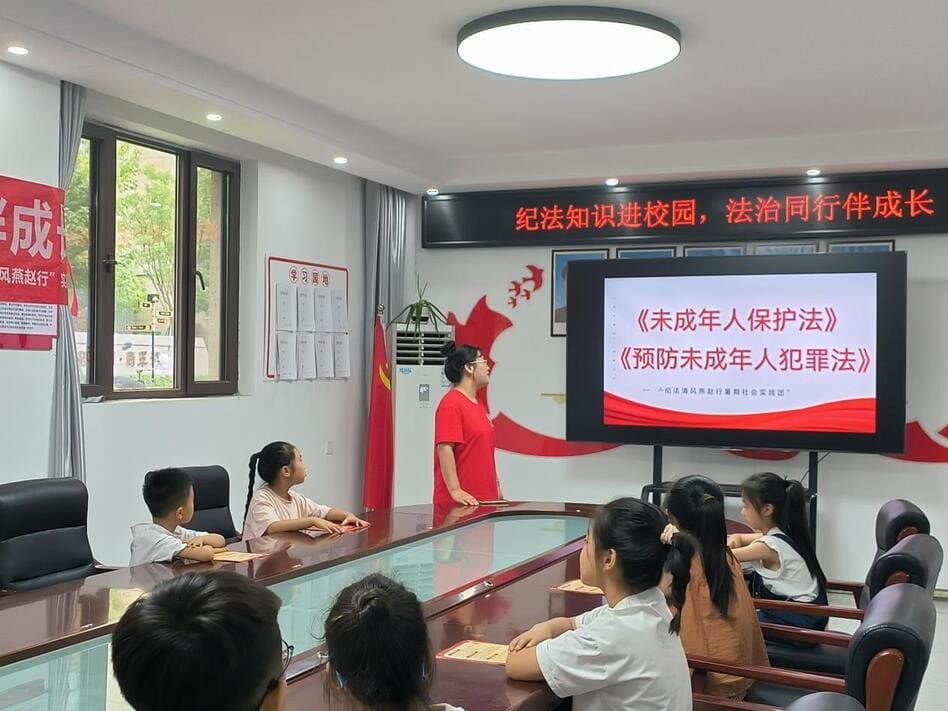 紀法知識進課堂,傳遞法治好聲音為提高未成年人自我保護能力,預防和減少未成年人違法犯罪行為,實踐隊員做足了充分的準備。從認真查閱相關法律法規資料到編輯宣傳冊;從制作課件到準備課堂講稿,無一處不活躍著實踐隊員們的影子。實踐隊員向小朋友們普及《未成年人保護法》和《預防未成年人犯罪法》,結合動畫視頻、實際案例和有獎問答等喜聞樂見的形式將復雜的法律條文轉化為通俗易懂的語言,給未成年人上好了一堂別開生面的紀法知識科普課。活動伊始,宣講隊員提出,“什么是未成年人呀?”小朋友們踴躍舉起雙手,答案不盡相同,他們帶著對知識的渴望和疑問認真聽講,明白原來未成年人是在座的他們,是未滿18周歲的公民;活動中期,宣講隊員以電影《少年的你》拉開校園霸凌的序幕,并聯系到該地3名初中生殘忍殺害同學的事件,讓小朋友們對校園霸凌有了更直觀深刻的認識。一位小朋友主動分享心得說:“遇到霸凌我會保護自己人身安全,并且告訴老師和家長!”掌聲如潮,其他小朋友也勇敢表達自己的想法,小朋友們紛紛表示受益匪淺。