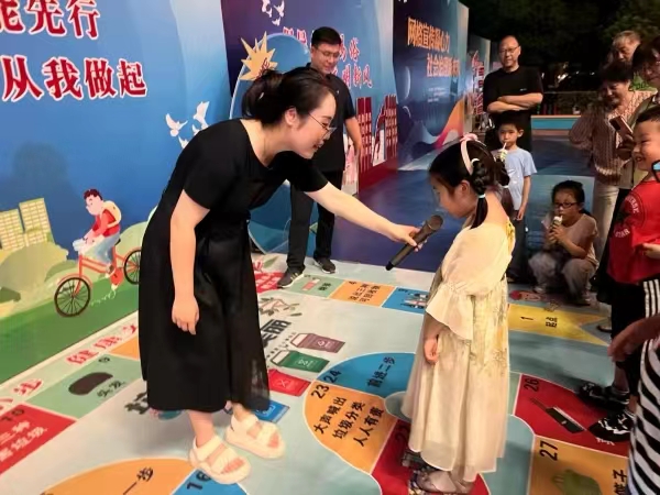 圖為現場活動宣傳圖 為了吸引更多居民了解參加低碳宣傳活動,團隊成語與社區工作人員設計了一場場精彩有趣的低碳小游戲,居民們自發組隊進行了趣味知識競答比賽,在游戲中學習了解低碳生活的理念知識。其中“垃圾分類大富翁”游戲最受歡迎,團隊成員組織居民們分組進行參加,居民們一邊投擲骰子,一邊在游戲棋盤上“旅行”,每到一站便需正確回答垃圾分類的問題才能前進,寓教于樂中加深了對環保知識的理解和記憶。現場笑聲與掌聲不斷,氣氛熱烈而溫馨,不僅增強了社區居民的環保意識,還促進了鄰里間的友好交流,讓低碳生活理念在歡聲笑語中深入人心。