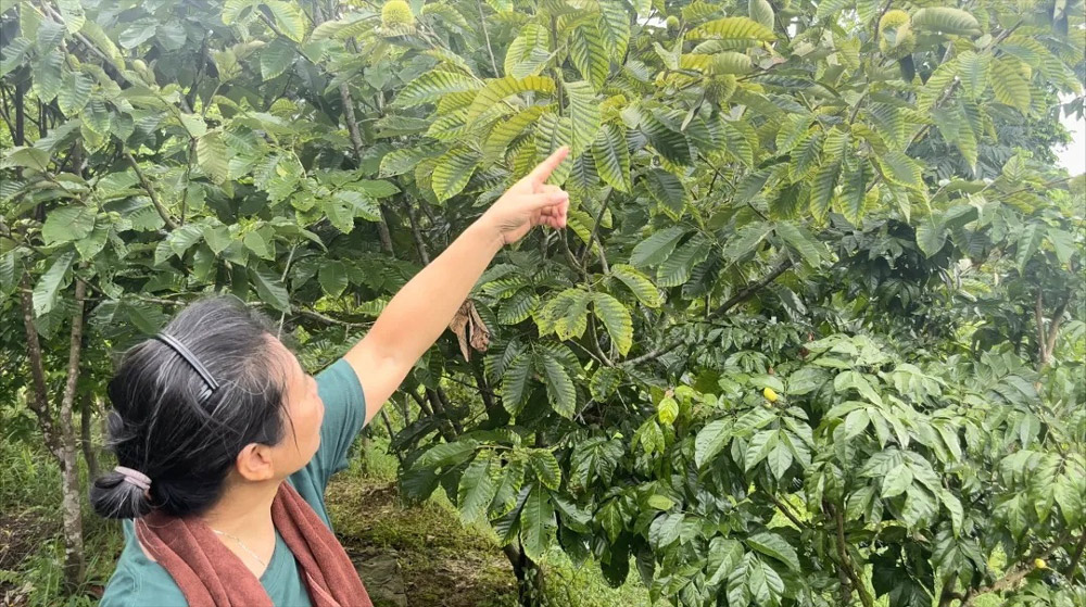 圖為中草藥基地負責人正在介紹板栗 作者:陳曉增