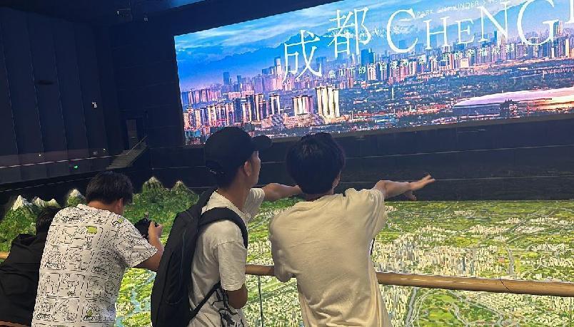 “這個沙盤做得好精致啊,天府大道、龍泉山脈、天府國際機場還有大運會新建的場館你都可以一一找到,就跟一個mini版成都似的。看了這個沙盤,我才知道成都原來這么大啊!”來自河北的隊員李涵宇指著沙盤,興奮地說道。